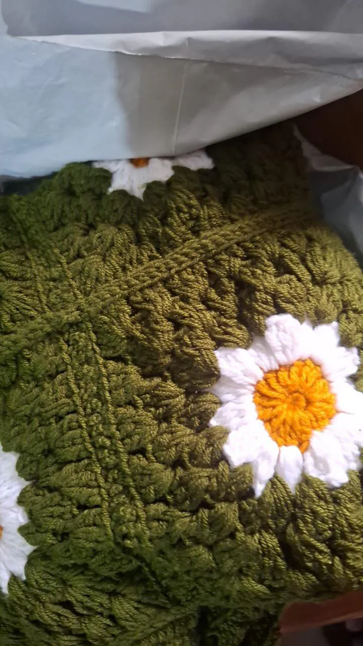 Cozy green crochet handmade cardigan-sweater with sunflower granny squares for girls. Soft, stylish, and perfect for adding a warm handmade touch to any outfit.